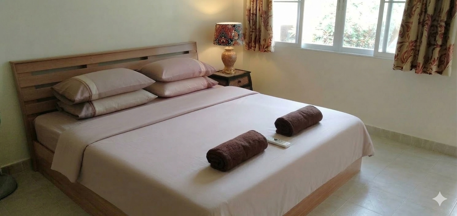 Bed with brown towels lamp and smooth pillows2 small image Bed with brown towels lamp and smooth pillows2 small image